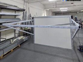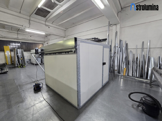 Gebäudematerial:Selbsttragende Rahmenkonstruktion aus Stahl.Isolierung aus Sandwichplatten mit 40mm Dicke, die von der Innenseite des Rahmens mit verzinkten Blechplatten 12/10 befestigt sind, so dass sieim Laufe der Zeit ausgetauscht werden können, ohne dass die Konstruktion demontiert werden muss. Die Isolierplatten werden nur in die Stahlprofile eingesetzt eingesetzt wird (keine versiegelten Platteninnerhalb eines Kanalprofils).Korrosionsschutzbehandlung des Stahls:Feuerverzinkung gemäß Norm UNI EN ISO 1461: Heißauftragung einer schützenden Metallbeschichtung durch Eintauchen in eingeschmolzenes Zinkbad; Qualitätsmanagement gemäß ISO 9001 und Zertifizierung des Verzinkungsbades gemäßDAST-022.Materialien:Isolierende Wandelemente, Stärke 40mm (EN 14509, Isolierte Metallpaneele für den Einsatz in Gebäuden – Verwendung: Wände). Außen- undInnenseite: aus Stahl mit glatter Oberfläche, 0,40 mm, Weißgrau RAL 9002.Konfiguration:Einzelner Innenraum.Rückseite, Seiten, Vorderseite: vollständige Ausfachung mit 40 mm dicken isolierten Paneelen.Vorderseite miteiner isolierten Tür mit einer Stärke von 40 mm, nach außen öffnend.Verschluss mit Pfosten und Vorhängeschloss oder eletronischischem Schloss (optional).Diagonale Querverstrebung hinten für das Dach in geöffneter Position.VOLLSTÄNDIGE Abdeckung mit 1 Neigung mittels 2 Platten aus 40 mm starker isolierter Wand mit hinterer Neigung und kleinem Überstand an 4 Seiten.Das Dach wird auf einen Stahlrahmen geschraubt, der mit der Unterkonstruktion verbunden ist und mittels eines Schiebemechanismus geöffnet werden kann.Der Abrollmechanismus besteht aus zwei Schienen, die wiederum aus oben angeschweißten, L-förmigen Profilen bestehen.Die oberen Stahlräder besitzen ein V-Profil und sowie eine Lagerung, Auf der unteren Seite des Rollmechanismus befinden sich Stützräder, um das Gleiten zu erleichtern und das Abheben des Daches zu verhindern.Am Ende (vorne und hinten) befinden sich Anschlagpunkte.Dacheinfassung:Die umlaufende Einfassung der Dachplatten besteht aus Aluminium-U-Profilen. Farbe: Weißgrau RAL 9002.