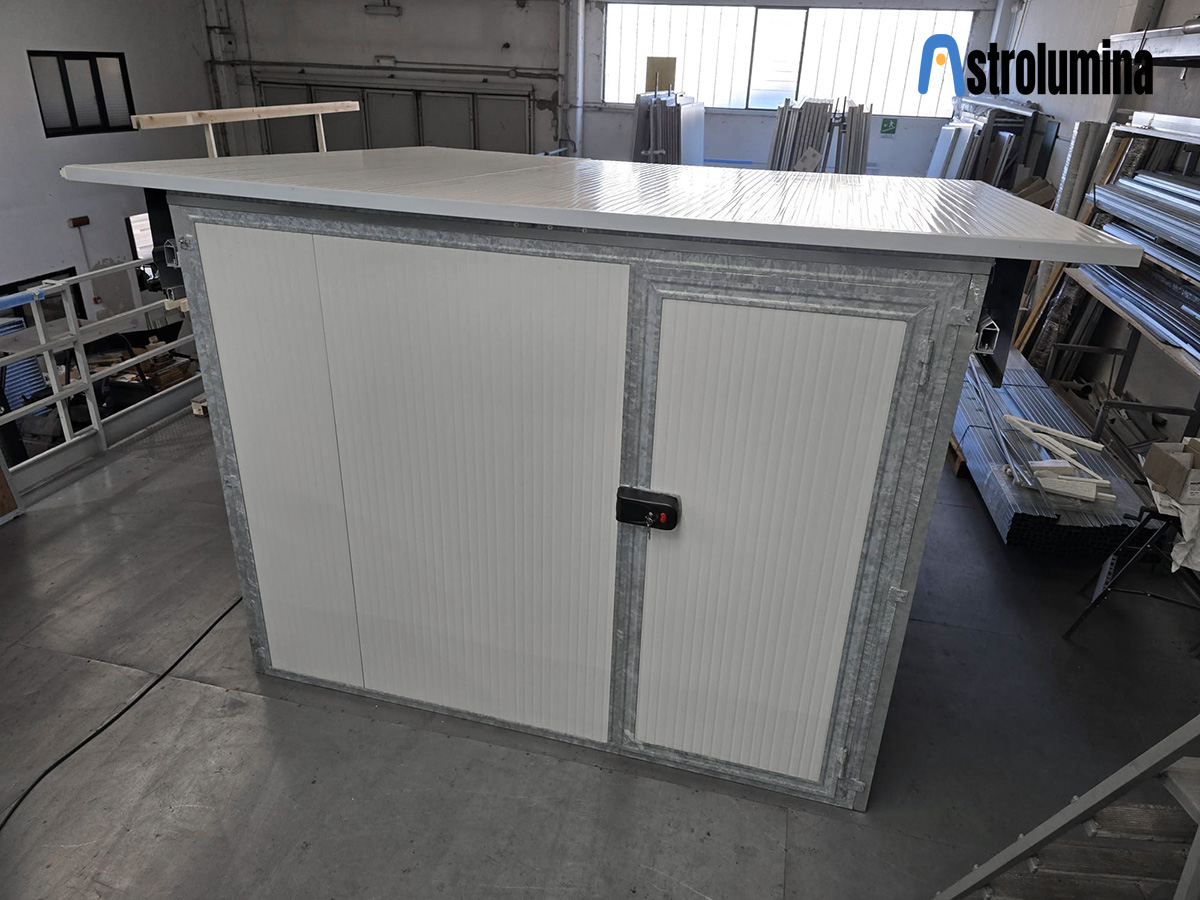 Gebäudematerial:Selbsttragende Rahmenkonstruktion aus Stahl.Isolierung aus Sandwichplatten mit 40mm Dicke, die von der Innenseite des Rahmens mit verzinkten Blechplatten 12/10 befestigt sind, so dass sieim Laufe der Zeit ausgetauscht werden können, ohne dass die Konstruktion demontiert werden muss. Die Isolierplatten werden nur in die Stahlprofile eingesetzt eingesetzt wird (keine versiegelten Platteninnerhalb eines Kanalprofils).Korrosionsschutzbehandlung des Stahls:Feuerverzinkung gemäß Norm UNI EN ISO 1461: Heißauftragung einer schützenden Metallbeschichtung durch Eintauchen in eingeschmolzenes Zinkbad; Qualitätsmanagement gemäß ISO 9001 und Zertifizierung des Verzinkungsbades gemäßDAST-022.Materialien:Isolierende Wandelemente, Stärke 40mm (EN 14509, Isolierte Metallpaneele für den Einsatz in Gebäuden – Verwendung: Wände). Außen- undInnenseite: aus Stahl mit glatter Oberfläche, 0,40 mm, Weißgrau RAL 9002.Konfiguration:Einzelner Innenraum.Rückseite, Seiten, Vorderseite: vollständige Ausfachung mit 40 mm dicken isolierten Paneelen.Vorderseite miteiner isolierten Tür mit einer Stärke von 40 mm, nach außen öffnend.Verschluss mit Pfosten und Vorhängeschloss oder eletronischischem Schloss (optional).Diagonale Querverstrebung hinten für das Dach in geöffneter Position.VOLLSTÄNDIGE Abdeckung mit 1 Neigung mittels 2 Platten aus 40 mm starker isolierter Wand mit hinterer Neigung und kleinem Überstand an 4 Seiten.Das Dach wird auf einen Stahlrahmen geschraubt, der mit der Unterkonstruktion verbunden ist und mittels eines Schiebemechanismus geöffnet werden kann.Der Abrollmechanismus besteht aus zwei Schienen, die wiederum aus oben angeschweißten, L-förmigen Profilen bestehen.Die oberen Stahlräder besitzen ein V-Profil und sowie eine Lagerung, Auf der unteren Seite des Rollmechanismus befinden sich Stützräder, um das Gleiten zu erleichtern und das Abheben des Daches zu verhindern.Am Ende (vorne und hinten) befinden sich Anschlagpunkte.Dacheinfassung:Die umlaufende Einfassung der Dachplatten besteht aus Aluminium-U-Profilen. Farbe: Weißgrau RAL 9002.
